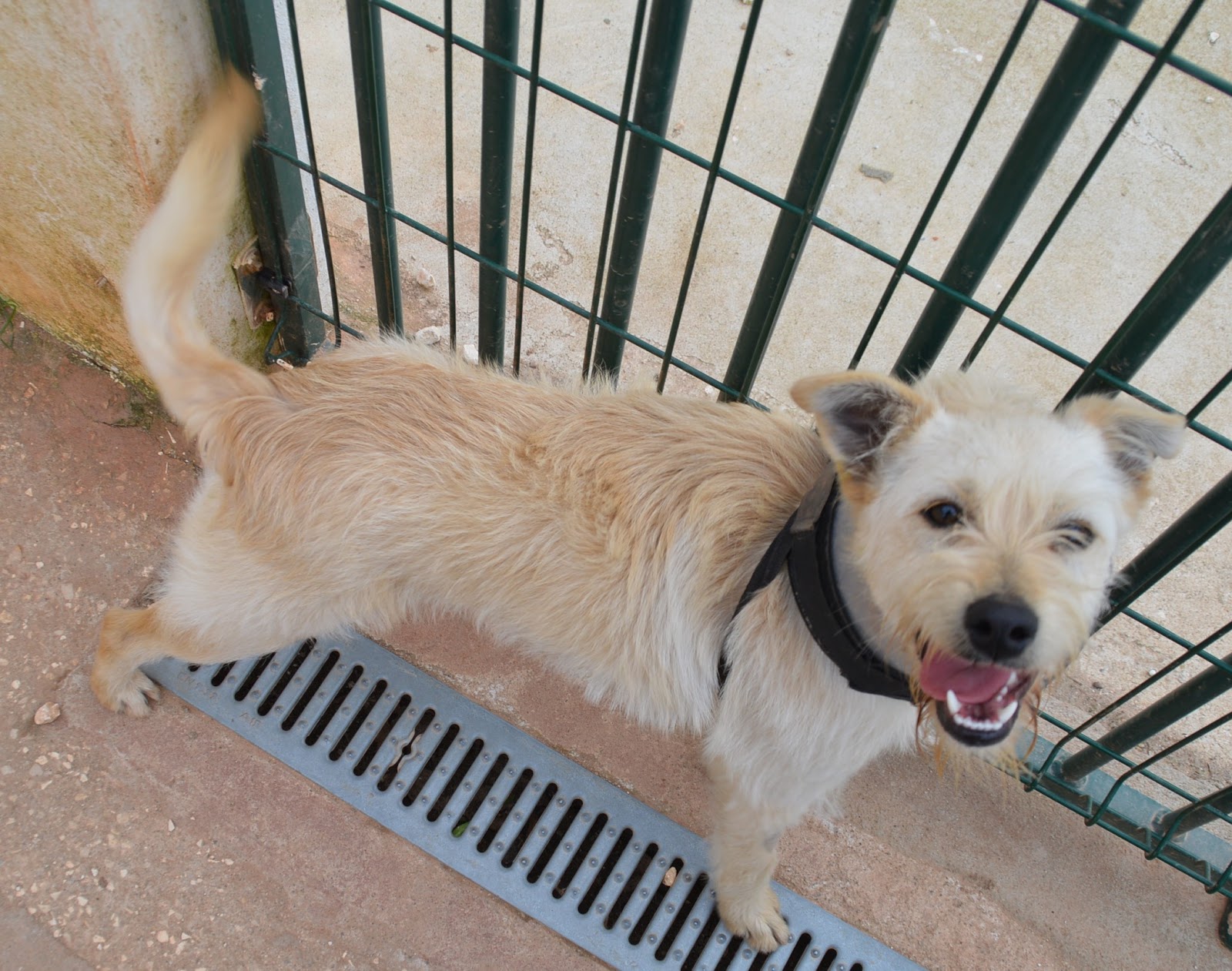 Dann hat Senhor Gilberto (der die andere blinde Hündin hat) bei Carla um Hilfe gebeten. Er geht fast täglich ins Tierheim in Caldas und da wäre eine Hündin, die ist vor 6 Wochen angefahren gefunden worden, hatte wohl keine gravierenden Verletzungen, aber man konnte sie nicht aus der Box holen. Sie knurrt und lässt sich nicht anfassen, es ist von einschläfern die Rede, aber wir sollten nicht sagen, dass er das gesagt hat. Carla hat dann die Amtsärztin von Caldas angerufen und Smalltalk über irgendwas anderes und wir hätten einen Zwinger frei und ob wir mal im Tierheim gucken könnten. Ich hab zu Carla gesagt, wenn das Problem nicht der Hund ist, dann nehm ich sie gleich mit. Also sind wir hin und wenn man dieses dunkle feuchte Loch von Tierheim sieht und obwohl es ja wenig Hunde sind hallt dort der Lärm. Sie hatte ganz rote Pfoten von der Feuchtigkeit im Beton. Die anderen Hunde werden ja wenn das Wetter gut ist draussen angebunden wenn die Boxen gespuelt werden. Bei ihr ging das ja nicht. Das einzig Gute war, dass sie durch ihre Verfressenheit auch sofort in die Transportbox ging, als wir da Futter reingepackt haben. Aber sie hat geknurrt. Sie ist auch nicht klein. Ich schätze mal 20 kg. Ich hatte Angst um meine Finger und nach ein paar Tagen konnte ich sie manchmal mit einer Handtuchrolle streicheln. Aber sie kann mit streicheln nix anfangen.